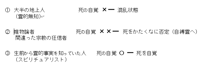 人間は死後、上図の経過を経て本来の住処である本格的な死後の世界(霊界)に入っていきます。本格的な霊の世界に赴く上で最初に障害となるのが、死の直後に自分の死を自覚できないということです。地上時代の霊的知識の有無によって、死後人間が置かれる状況は異なります。